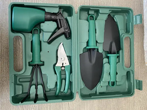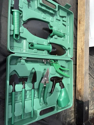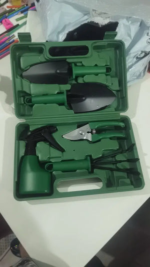 Setul include unelte esențiale precum cuțite, greblă și lopată, toate într-o carcasă practică pentru depozitare.